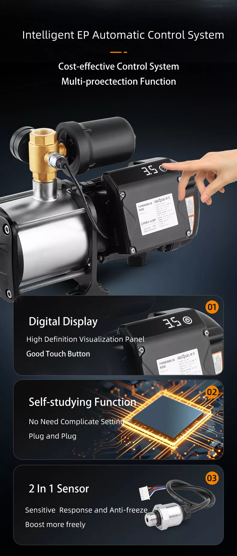 CHM2-4/EP | 0.55 | 4.5 | 40 | 2m3/H@32m | 4 | 322x174x255 | 12.5 |